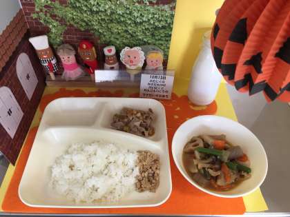 本日の給食の「ツナ大豆そぼろ」は、平成26年度の学校給食献立調理検討会議で開発された献立で、ツナとひきわり大豆を主材にしたご飯によく合う一品でした。