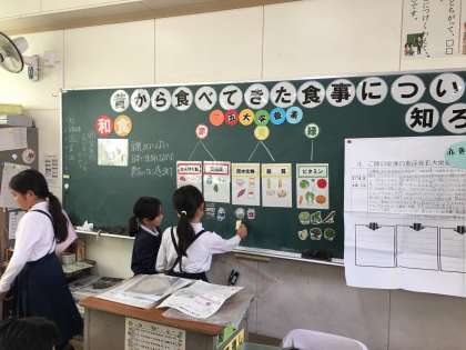 本日は5年生で栄養教諭による栄養指導がありました。「昔から食べてきた食事について知ろう!」で和食の給食を5大栄養素に分ける学習をしました。子ども達は意慾的に授業に参加していました。「五大栄養素がわっかた。」「お米のすばらしさがわかった」などのたくさんの感想がありました。