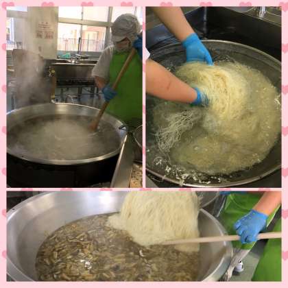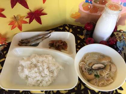 本日の給食は、「ご飯、焼きししゃも、にゅうめん、きんぴらごぼう、牛乳」でした。
