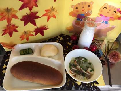 本日の給食は、「肉うどん、あっさりきゅうり、りんご、黒糖パン、牛乳」でした。