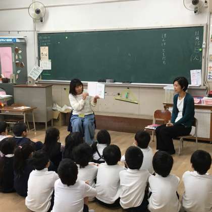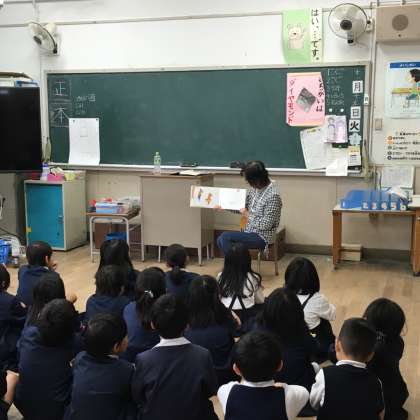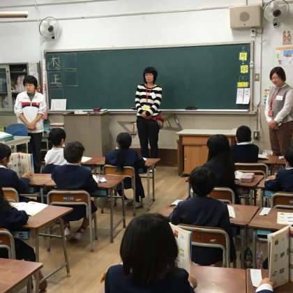 11月15日(火)1年生は、国語科の「ほんはともだち」の学習に合わせて、図書館ボランティアの「カラフルBOOKちゃん」の方に来ていただいて活動内容の紹介や本の読み聞かせをしてもらいました。子ども達は、とても楽しそうにお話を聞いていました。今日読んでもらった本と教科書いで紹介されている本もすべて子ども達が読めるように2組の廊下に用意していただきました。「カラフルBOOKちゃん」の皆さん、ありがとうございました。