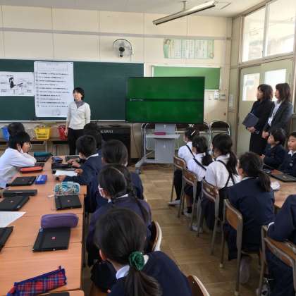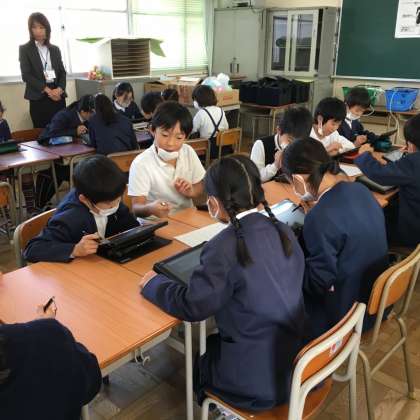 11月25日(金)4年生ではベネッセコーポレーションの方に来ていただいてタブレットを使った学習をしました。今回は、図工と算数のコラボしたような授業でした。子ども達は、タブレットの使い方にだんだん慣れてきた様子で楽しそうに課題に取り組んでいました。放課後には、教職員を対象にした研修会もしていただきました。