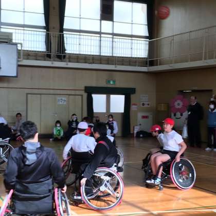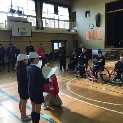 2月8日(水)5時間目に5年生となかよし学級の児童が日本代表女子車椅子バスケットボールチームと交流会を行いました。これは区役所の企画で実施されたものです。はじめに競技用車椅子に乗る体験を全員でしました。次に児童の代表とバスケットボールの試合をしました。最後に子どもも達と地元の企業の方が選手に花束やプレゼントを渡しました。日本代表の選手のプレーに子ども達は終始大喜びでした。明日から中央体育館で行われる国際親善バスケットボール大会でも活躍されることを願っています。選手の皆さん、ありがとうございました。