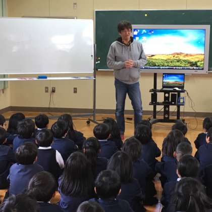 3月7日(火)1年生から3年生は,自然環境などの研究をされている瀬口さんに来ていただいてビオトープを中心とした環境学習を行いました。ビオトープの意味、土や空気、水の大切さについて紙芝居を通して教えていただきました。子ども達は、担任の先生も登場する紙芝居をとても楽しそうに見ていました。これからも自然に興味をもつ子どもが増えてくれるとよいと思っています。