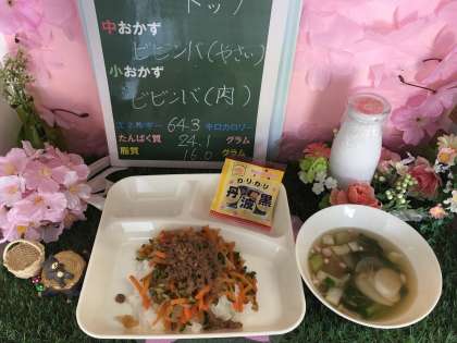 本日の給食は、「ビビンバ、トック、いり黒豆、牛乳」でした。
