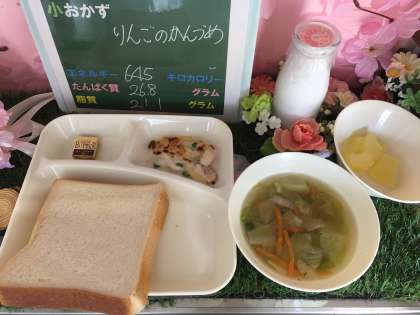 本日の給食は、「食パン、牛乳、マカロニグラタン、レタスのスープ、りんご(缶)」でした。
