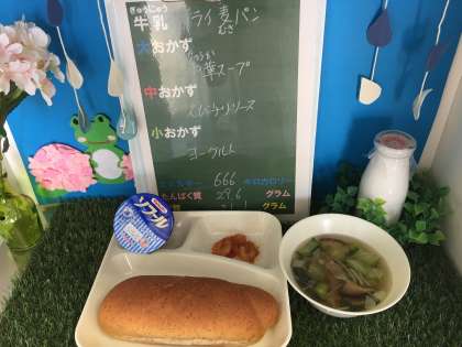 本日の給食は、「ライ麦パン、えびのチリソース、中華スープ、ヨーグルト、牛乳」でした。