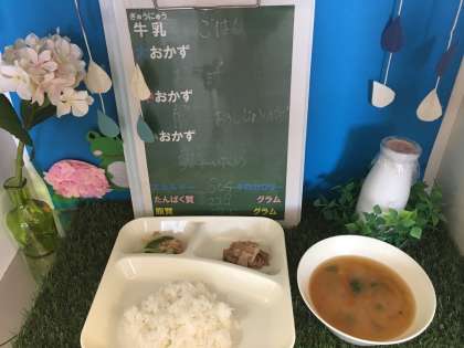 本日の給食は、「米飯、豚肉のおろしじょうゆかけ、みそ汁、野菜いため、牛乳」でした。