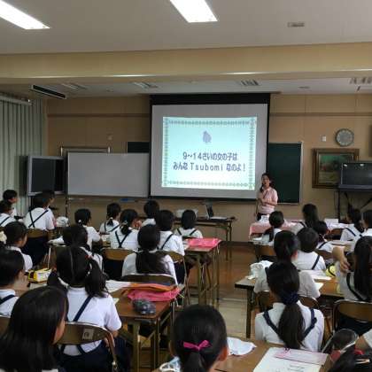 7月12日(水)林間学習を前に保健指導の一環として、外部講師を招いて5年生の女子児童につぼみスクールを開催しました。自分のからだが、成長によってどんなふうに変化をするのか、下着はどんなのを選んだらいいのか、からだのサイズの計測の仕方など、詳しく話を聞きました。またご家庭でも話を聞いてあげてほしいと思います。