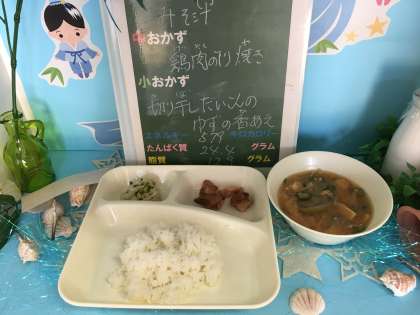 本日の給食は、「ご飯、鶏肉のてり焼き、みそ汁、切り干しだいこんのゆずの香あえ、牛乳」でした。