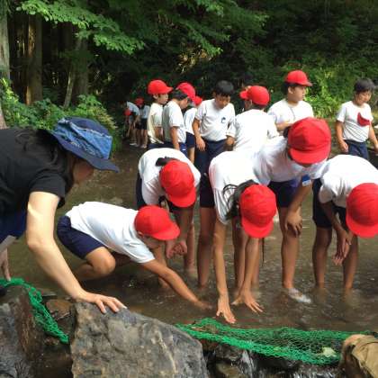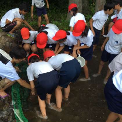 今日は天候にも恵まれ、ネイチャーゲームの後に予定通り魚つかみをしています。
