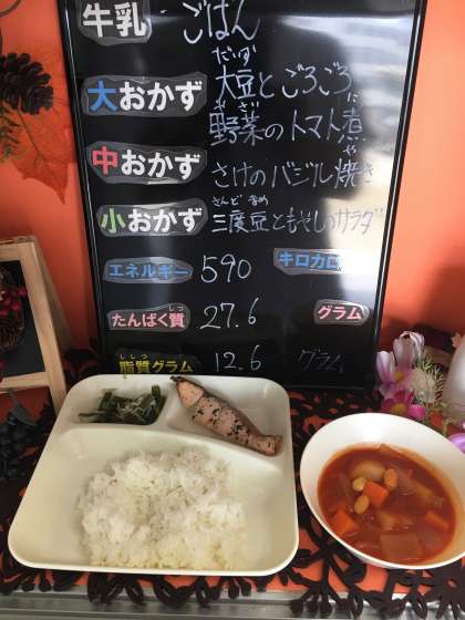 献立のねらいは、魚、大豆、野菜を使った洋風の健康メニューを考え、ご飯に合うように、味つけ、組合せを工夫したそうです。