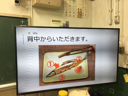 さんまの食べ方を教室の大型テレビで映し、食べる順番や骨のとり方、後片付けの仕方などを給食時間に学習しました。