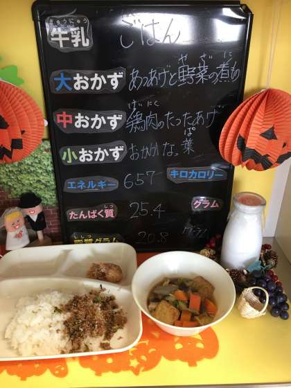 本日の給食は、ごはん、鶏肉のたつたあげ、あつあげと野菜の煮もの、おかかなっ葉、牛乳でした。