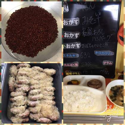 本日の給食は、ご飯、和風おろしハンバーグ、みそ汁、かぼちゃのいとこ煮、牛乳でした。