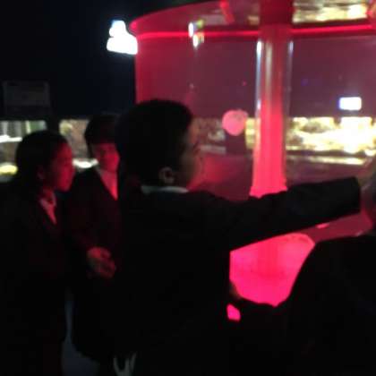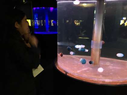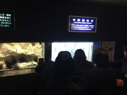 志摩マリンランドで水槽を興味深そうにのぞき込んでいます。