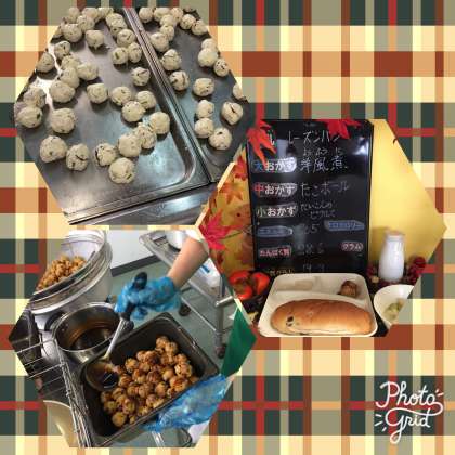 本日の給食は、「レーズンパン、牛乳、たこボール、洋風煮、だいこんのピクルス」でした。