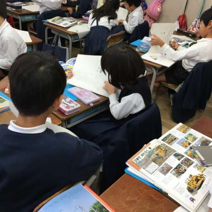 11月13日(月)1年3組で国語科の授業研究会がありました。単元は「のりもののことをしらべよう」ということで乗り物の本を読んで調べたことをカードにまとめる学習でした。子ども達は、思い思いの乗り物の本を調べ「やくめ」「つくり」「できること」に分けて一生懸命まとめていました。その後、ペアトークをして交流していました。次の時間は、みんなで交流します。