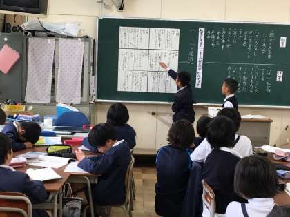 11月22日(水)4年2組で国語科の授業研究会を行いました。「くらしの中の和と洋を調べよう」という題の説明的文章の学習でした。子ども達は、和室と洋室のそれぞれのよいところを読みとって、楽しそうにペアで話し合ったり、グループで意見交流をしていました。最後にどちらが好みか、グループごとに発表していました。授業の後、元芦屋大学の坪田先生から説明的文章の授業の進め方や次期学習指導要領についてのお話をしていただきました。