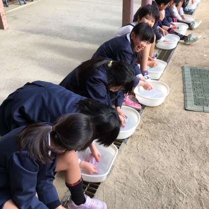 11月28日(火)3年生で保健指導を行いました。「毎日の健康と生活」と題して、体を清潔に保つにはどうしたらよいかについて学習しました。そして、手洗い,うがい週間に合わせて自分が使ったハンカチの洗たくもしました。子ども達は、少し冷たいと言いながら楽しそうに自分のハンカチを洗って干していました。これからも清潔なハンカチを身につけるよう気をつけてほしいと思います。