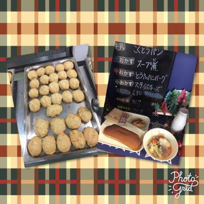 本日の給食は、「とうふハンバーグ、スープ煮、スライスチーズ、黒糖パン、牛乳」でした。