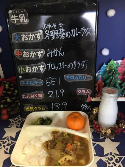 本日の給食は、「冬野菜のカレーライス、ブロッコリーのサラダ、みかん、牛乳」でした。