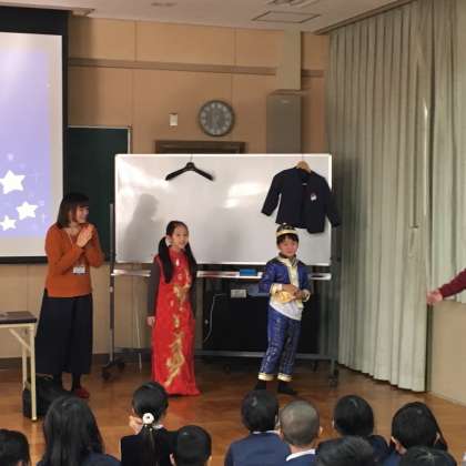 12月21日(木)2年生は、国際理解教育の一環として国際交流センターから中国の方に来ていただいてお話を聞きました。町の様子、万里の長城、中国料理、数の数え方、遊びなど中国のことをたくさん教えていただきました。「きらきらぼし」を中国語で歌ったり、衣装も着させてもらったりしました。子ども達は、とても楽しそうにお話に耳を傾けていました。