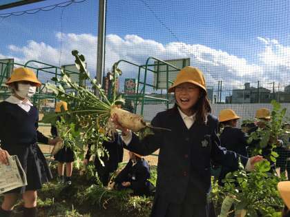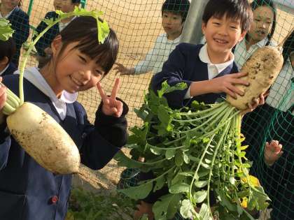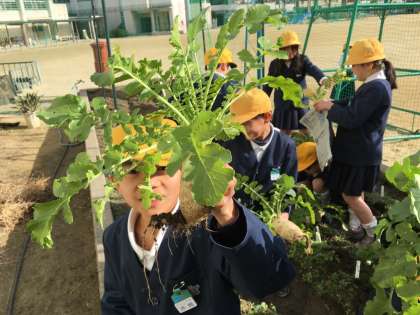 1月11日(木)今日、3年生は、田辺大根の収穫をしました。思っていたよりずいぶん大きく成長していました。子ども達は自分の名札のついている大根を楽しそうにぬいていました。葉っぱが大きくても実が小さいもの、逆に葉っぱが小さいのに実の大きいものなどさまざまでした。おうちに持って帰っておでんや煮物にしてたべてほしいと思います。