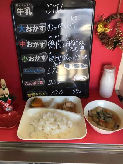 本日の給食は、「ご飯、牛乳、鶏肉と白ねぎのいため煮、のっぺい汁、焼きかぼちゃのごまだれかけ」でした。
