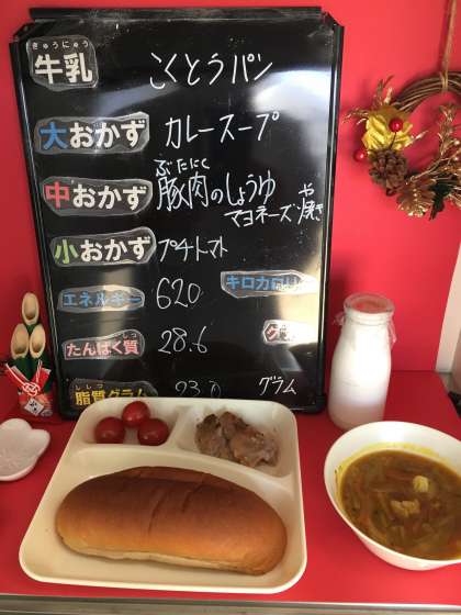 本日の給食は、「黒糖パン、牛乳、豚肉のしょうゆマヨネーズ焼き、カレースープ、プチトマト」でした。