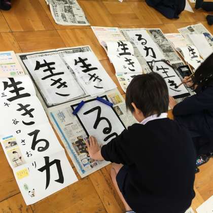 1月19日(金)3年生は多目的室で書初めに挑戦しました。書いたのは「生きる力」という文字です。初めて長い書道用紙に書くとあって真剣です。先生から書き方の注意を受けた後、いよいよ練習です。子ども達はお手本をよく見ながら一生懸命取り組んでいました。寒い中でしたがとてもよく頑張っていたと思います。