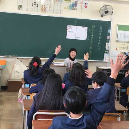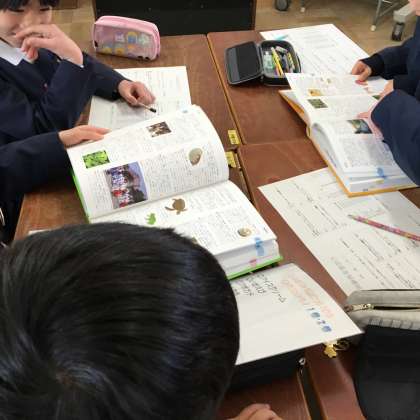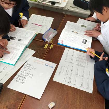 2月5日(火)4年3はじめに組で国語科の授業研究会が行われました。「百科事典を使ってみよう」という学習です。はじめに百科事典の各部の名称や調べ方を学びました。その後、グループで協力しながら百科事典を使って食べ物クイズに答えていました。子ども達は、とても一生懸命に学習に取り組んでいました。これからもわからないことがあれば、どんどん使ってほしいと思います。