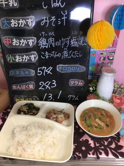 本日の給食は、「ご飯、牛乳、鶏肉のゆず塩焼き、みそ汁、こまつなの煮びたし」でした。