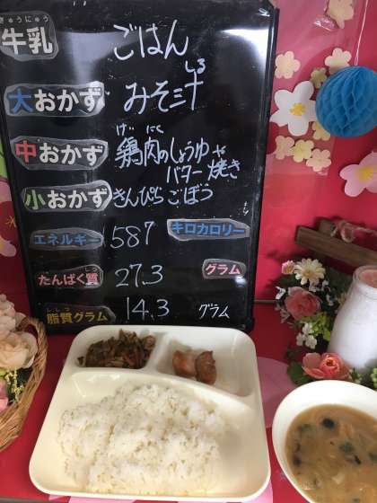 今年度最後の給食は、「ご飯、牛乳、鶏肉のしょうゆバター焼き、みそ汁、きんぴらごぼう」でした。