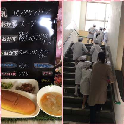 本日の給食は、「パンプキンパン、牛乳、豚肉のデミグラスソース、スープ、キャベツとピーマンのソテー」でした。