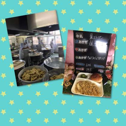 本日の給食は「黒糖パン、牛乳、焼きそば、きゅうりのしょうがづけ」でした。