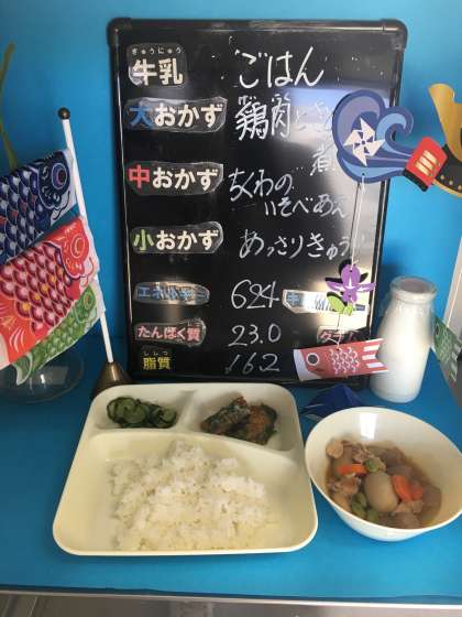 本日の給食は「米飯、牛乳、ちくわのいそべあげ、鶏肉とさといもの煮もの、あっさりきゅうり」でした。