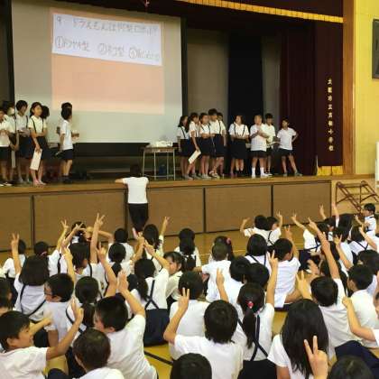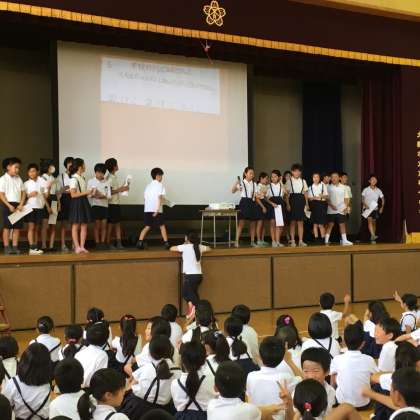 6月27日(水)集会委員会の人が中心となって全校集会が開かれました。今日は育和小学校に関係するクイズでした。3択の問題が出題されtると子ども達はとても嬉しそうに答えていました。クイズが進むにつれてどんどん盛り上がり楽しいい集会になりました。集会委員会の皆さん、ありがとうございました。