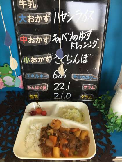 本日の給食は、「ハヤシライス、牛乳、キャベツのゆずドレッシング、さくらんぼ」でした。