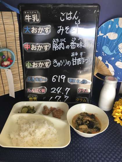 本日の給食は「ご飯、牛乳、豚肉の香味あげ、みそ汁、きゅうりの甘酢づけ」でした。