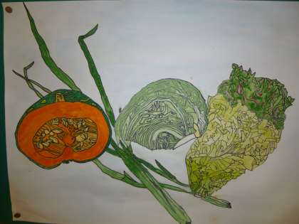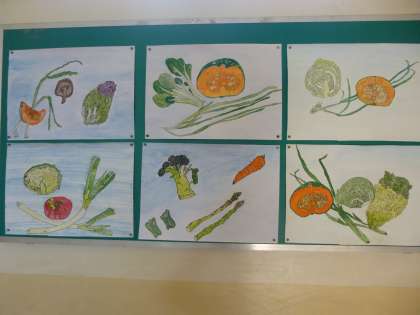 5年生の作品は「野菜を描こう」です。精密な描写と本物かと見間違うような色彩感覚は驚きです。階段おどり場に作品が掲示してありますが、来校される人は、どなたも足を止めて見入っていらっしゃいます。教室には、今回掲載した作品に負けない作品がずらりと並んでいます。