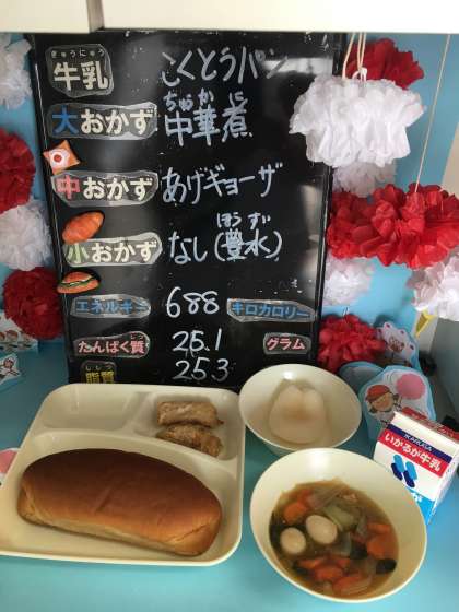 本日の給食は、「黒糖パン、牛乳、あげギョーザ、中華煮、なし(豊水)」でした。
