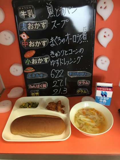 今日の給食は、「黒糖パン、牛乳、まぐろのオーロラ煮、スープ、きゅうりとコーンのゆずドレッシング」でした。