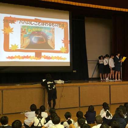 10月31日(水)児童集会の時に読書週間にちなんで図書委員会が発表を行いました。内容は、5年1組から6年3組までの学級で面白いと思った本を紹介し、みんなの拍手が多いものをチャンプ本に選ぶというビブリオバトルでした。どの学級から紹介された本も面白そうでしたが、5年2組が紹介した「パパの仕事はわるもの」という本がチャンプ本に選ばれました。今日、紹介された本はすべて図書館にありますので、読んでほしいと思います。図書委員会の皆さん、ご苦労様でした。