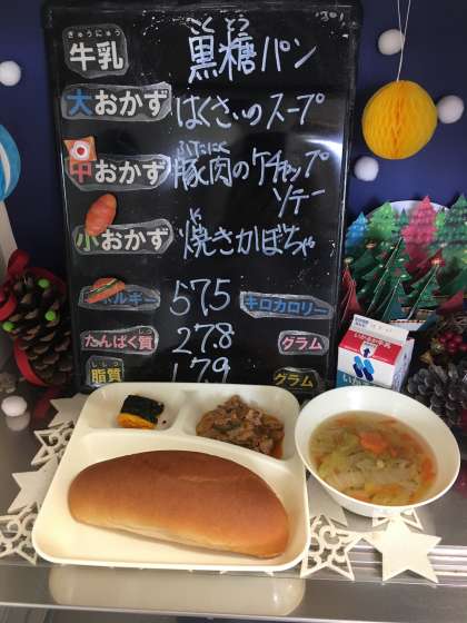 本日の給食は、「黒糖パン、牛乳、豚肉のケチャップソテー、はくさいのスープ、焼きかぼちゃ」でした。