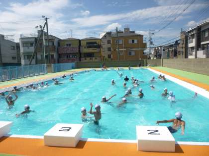 夏休みに入った学校では、9時から1時間ごとに、高学年、中学年、低学年の順にプール開放を行っています。毎日暑い日が続き、プールは大勢の子どもたちの歓声に包まれています。