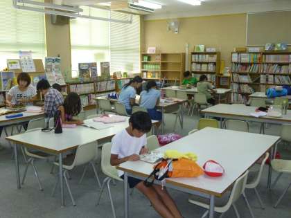 プール開放と同じく、図書室が図書館ボランティアの皆さんのおかげで毎日開放されています。読書にいそしむ児童、宿題に励む児童でにぎわっています。在庫確認の作業は、ボランティアさんが担当していただいています。