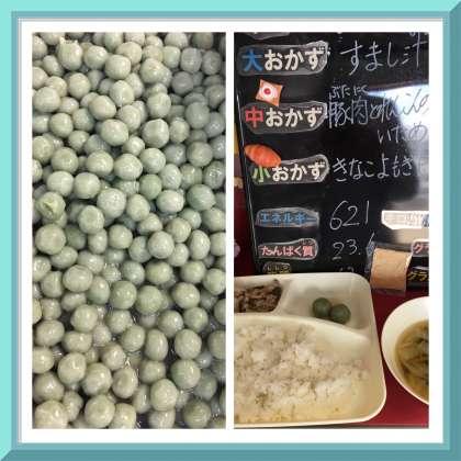 本日の給食は、「ご飯、牛乳、豚肉とれんこんのいため煮、すまし汁、きな粉よもぎだんご」でした。