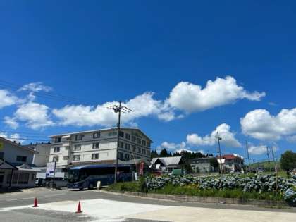 ハチ高原、白樺荘に到着しました。駐車場にはまだ紫陽花が咲いています。