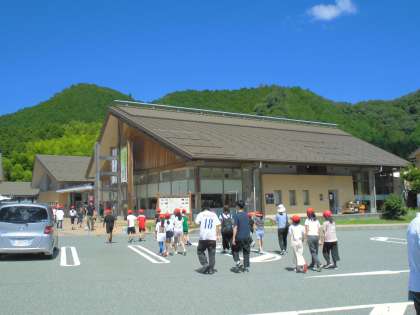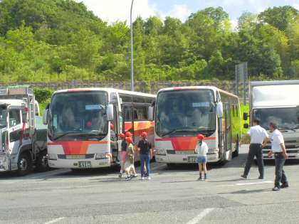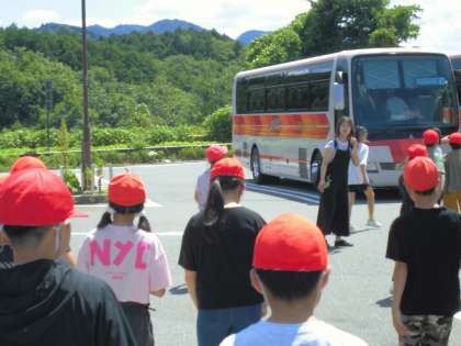 宿舎までの休憩タイムの様子です。大阪市から、育和小学校以外の学校のバスともたくさん出会いました。「お気をつけて」「先生のところも、お気をつけて!」…中には、ハチ高原で出会うところもありそうです。
